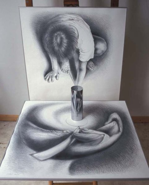 Ilyenek az anamorfózist használó művészeti alkotások is, amelyet elsőként Leonardo da Vinci írt le és keltett életre két vázlatrajzában a Codex Antlanticusban. Igaz, ekkor már sokan foglalkoztak a kitüntetett pont kérdésével (pl.: Archimedes) vagyis a hellyel, amely új dimenziókat nyit meg.