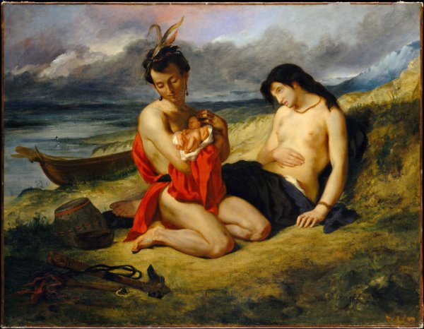 Eugéne Delacroix Szabadság című festményét mind ismerjük. A szerencsésebbek látták is a páriszi Louvre-ban is. A történelemkönyvünk hasábjain (a francia forradalom kapcsán) és a rajzórákon is találkoztunk a romantika tanulmányozása közben e festményével. A fent látható kép egy irodalmi mű az Atala című novellához készült, amely a Natchez törzs hányattatott sorsát meséli el, két vadászon keresztül. A Natchez című 1823-124 között készült festményt azt a pillanatot örökíti meg, ahol az édesapa karjaiba veszi gyermekét, közvetlen megszületése után.